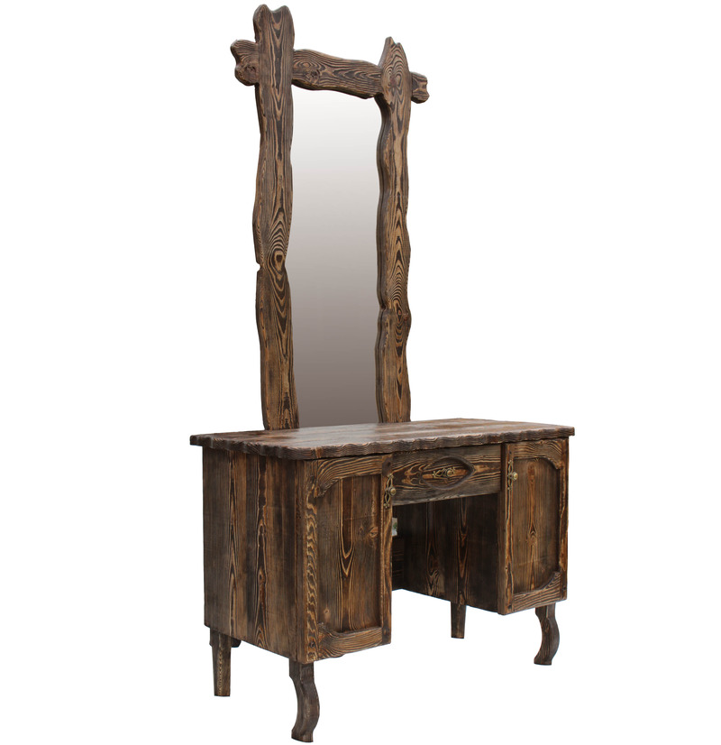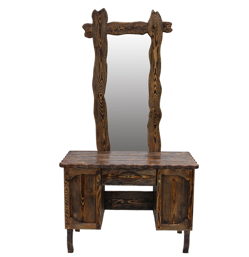 Трюмо с зеркалом отличается прочностью и оригинальным дизайном. Такая мебель станет прекрасным дополнением интерьера в стиле "под старину" или этническом стиле. Дополнительно можно заказать кровать, прикроватные тумбочки под старину, а также другую мебель из этой серии (тумба под ТВ, шкаф платяной и т. д.)