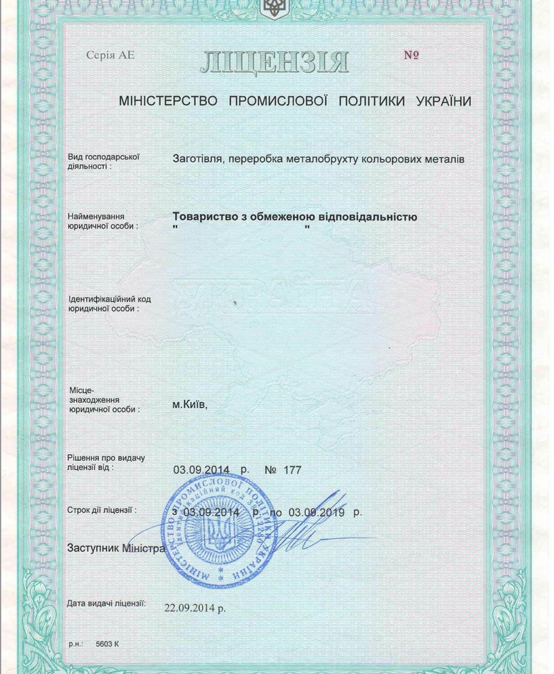 Продаётся компания с лицензией на работу с чёрными и цветными металлами, действующая до 2019 года, плательщик НДС с 03.2014 г. Предприятие с реальной площадкой в Винницкой обл. с возможностью работать там. Район расположения площадки имеет ж/д пути, т.е. есть возможность наладить транспортировку.