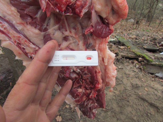 Тест основан на принципе тонкослойной иммунохроматографии - если говорить проще, то типа теста на беременность. Тест направлен на выявление антител в крови или сукровице мяса (даже после одной заморозки). Вероятность определения 99%.
