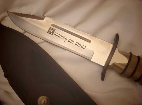 Нанесения текста или изображения, методом лазерной гравировки, как на лезвие так и на рукоять ножа. Сделать свой предмет уникальным, или подарок незабываемым можно у нас, потратив на все до 20 минут. Наши мастера вместе с вами подготовят соответствующий макет. Результатом будете довольны, звоните.