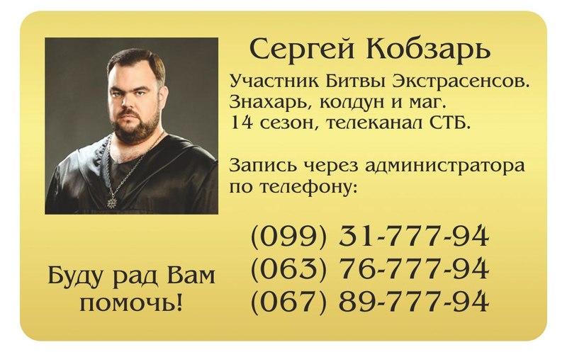 Сергей Кобзарь, Знахарь, Колдун и Маг (участник "Битвы Экстрасенсов") будет рад оказать Вам быструю и эффективную магическую помощь!