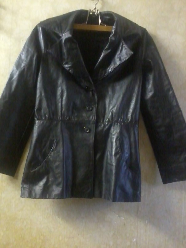 Кожаная куртка на пуговицах выполнена из гладкой кожи. Кожа чёрного цвета, мягкая, приятная на ощупь. Классическая кожаная куртка прямого кроя на трёх пуговицах. Длина изделия 70 см (44 размер). Удобные карманы. Внутренних карманов нет. Хороший выбор для людей предпочитающих деловой стиль в верхней одежде. Цена 500 грн. Просьба - не пишите на Email, звоните. Перешлю по Украине "Новой почтой".