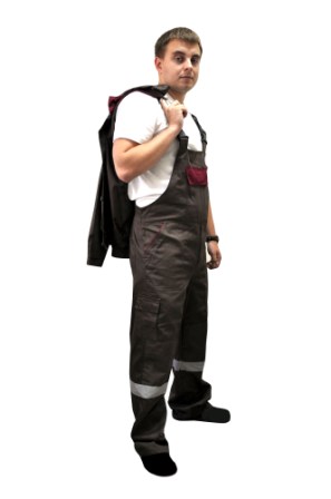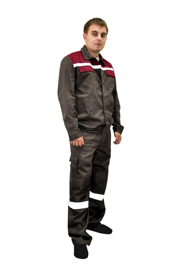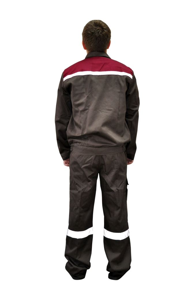 Костюм состоит из куртки и полукомбинезона . Комбинация цвета на куртке и полукомбинезоне - Коричневый и бордовый . Материал - ткань Саржа( повышенная прочность ткани ) плотность 245грм – состав хлопок 80 %