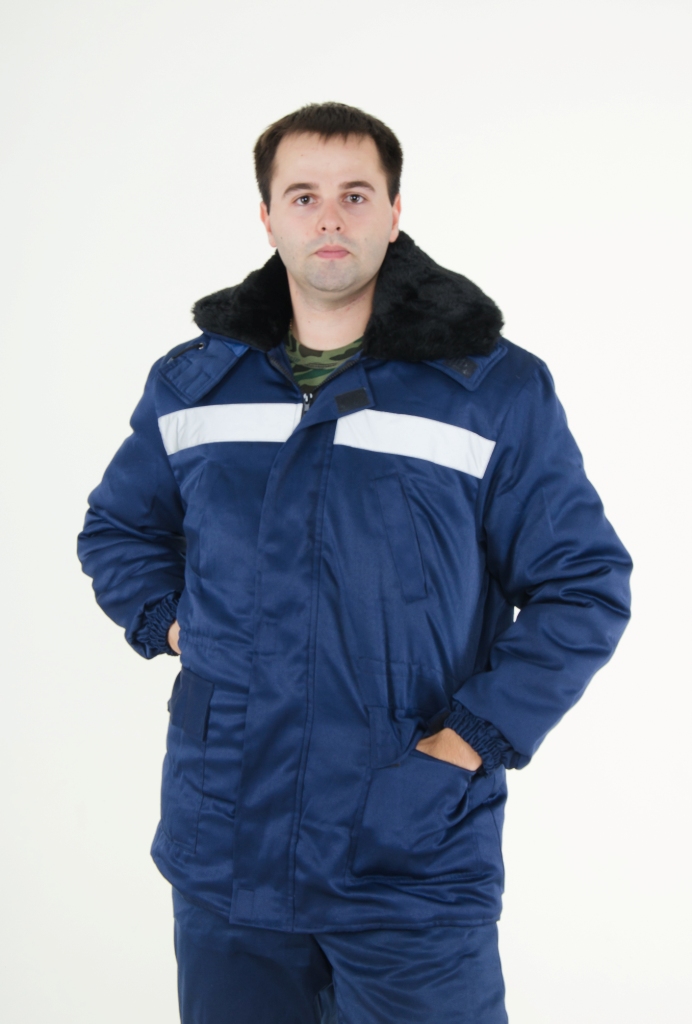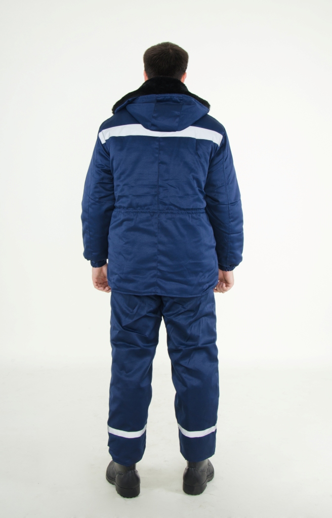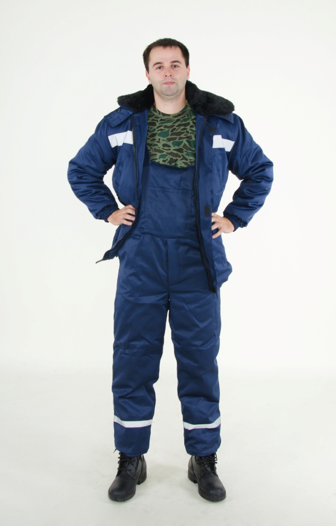 Куртка на молнии с дополнительной планкой защиты молнии от продувания . Верхние карманы косые . Нижние карманы на липучке . В рукавах - резинки для защиты от ветра . Утягивающие шнуры по поясу куртки. Комбинезон стандартный – утеплитель синтепон и со светоотражающими лентами . Карманы по бокакм и на груди – светоотражающие ленты на брюках ..