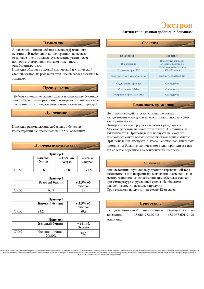 Реализуем эффективную антидетонационную добавку к бензинам Экстрон. Используется в диапазоне от 0, 5 до 2, 5% по объему. В зависимости от дозировки и базовой основы повышает октановое число от 3, 5 (0, 5% добавки) до 11 (2, 5% добавки) единиц по моторному методу. Отлично совмещается и даёт мощные октаноповышающие эффекты с эфирами, топливным этанолом, ароматическими углеводородами, монометиланилином.