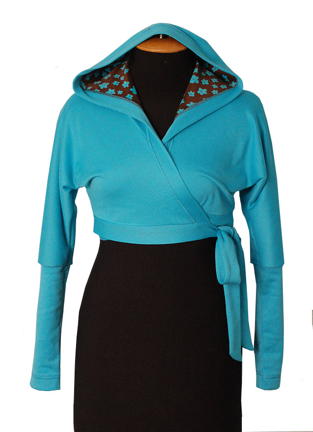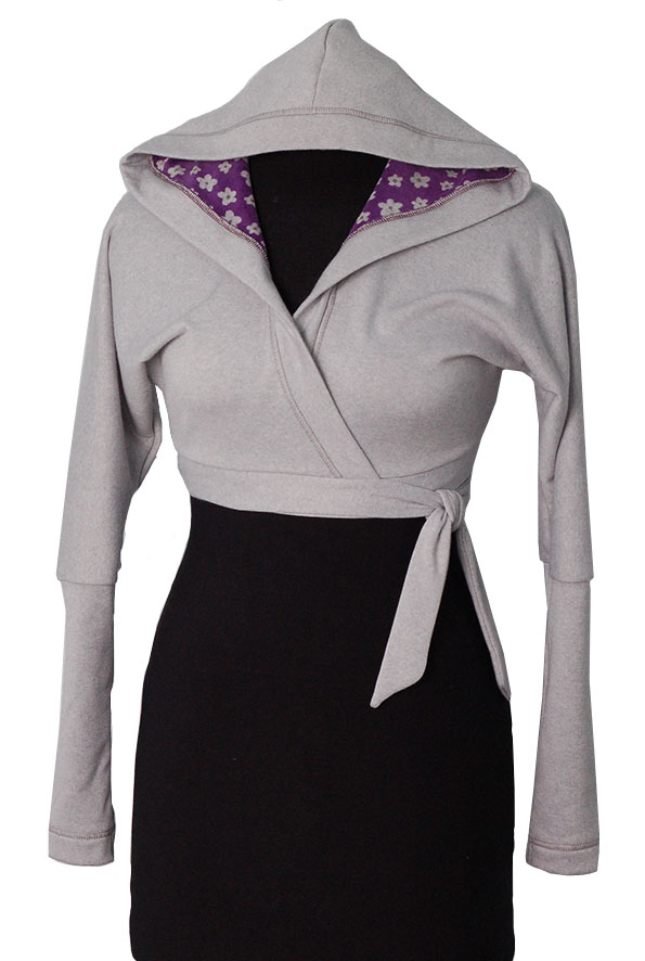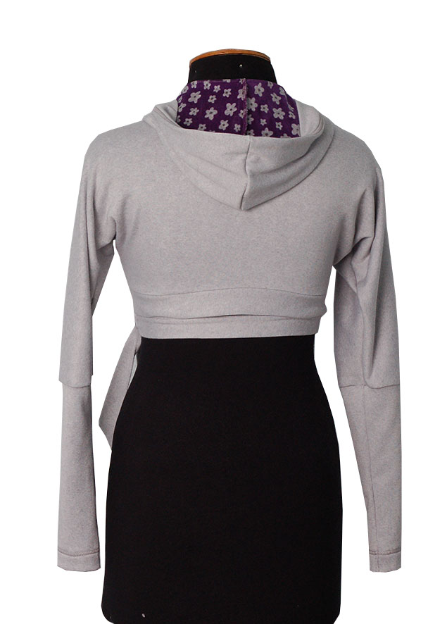 Болеро с длинным рукавом на запах серого цвета, с капюшоном. Одевать лучше на гольф, футболку или майку. Хорошо сочетается с джинсами.