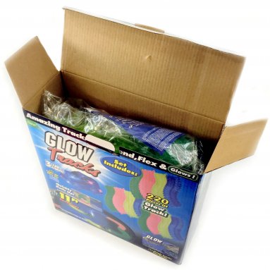 Трасса светиться в темноте. В машинке встроено 3 светодиода. Длинна трассы в собранном виде 3 м.