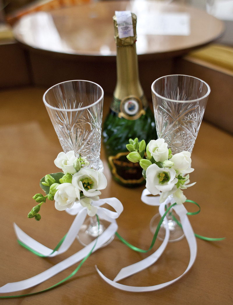 Оформление свадебных бокалов утонченными мини композициями из живых цветов - это эффектная деталь для Вашего свадебного фото. Эксклюзивное оформление свадебных бокалов выполняется в соответствии со всей стилистикой брачной церемонии