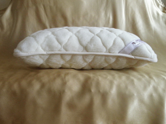 Подушка 50*70ромб) в наволочке с молнией из натуральной шерсти мериноса. Наволочка имеет приятный молочный цвет неокрашеной шерсти, внутри наполнитель "Холофайбер" в натуральной ткани Джерси, который имеет и поддерживает память формы подушки, идеально заполняя шейную впадину и расслабляет шейный отдел позвоночника. За счет натуральной шерсти которая прогревает своим сухим теплом уменьшает боли в шейном отделе при остеохондрозе