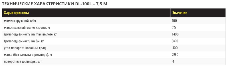 Лесной гидроманипулятор DL-100L, выпускаемый нашей компанией - ООО "ВЕЛМАШ-УКРАИНА" (г. Харьков) по лицензии ООО "ВЕЛМАШ-С" (входит в Palfinger), является следующим этапом в развитии линейки "тяжелых" гидроманипуляторов ВЕЛМАШ ОМТЛ-97. Разработан для работы с "крупным" лесом и предназначен для погрузки сортиментов и хлыстов большой массы, имеет увеличенный по сравнению с гидроманипуляторами серии DL-80 (ОМТЛ-70) грузовой момент, при сопоставимой собственной массе. DL-100L имеет L-образную (продольную) схему складывания в транспортное положение и может быть смонтирован как за кабиной лесовозного автомобиля, так и на заднем свесе рамы автомобилей КамАЗ, Урал, МАЗ, КрАЗ, также используется в составе специальных машин.