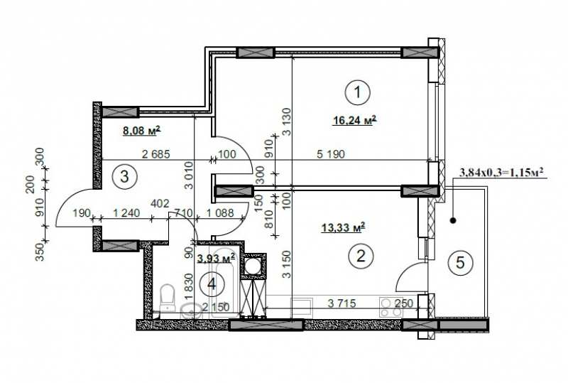 5. Балкон не застеклен - 1, 15 м2