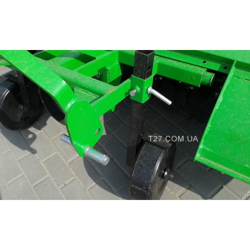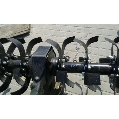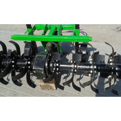 Рабочие органы (60 пластинчатых ножей, 30 левых и 30 правых) закреплены на 10-ти вращающихся валах, по 6 в каждой секции. Диски с ножами изогнутой формы (изготовлены из легированной стали) входят в грунт под определенным углом, что позволяет легко справляться с обработкой различных типов почв, контролировать нагрузку основных рабочих механизмов фрезы в сцепке с трактором. Барабан приводится в действие от вала отбора мощности, глубину обработки можно регулировать благодаря отверстиям на стойках транспортировочных колес.