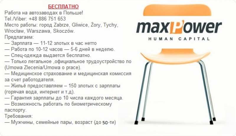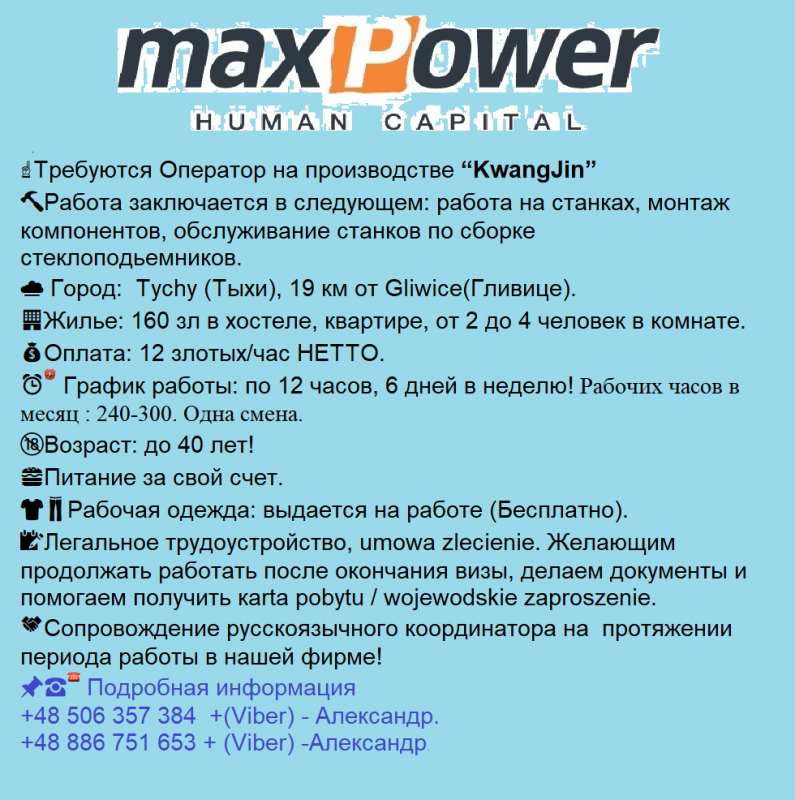Сама работа предлагается в городе Tychy (Тыхи), это 19 км от Gliwice(Гливице). Оплата за работу оператором на производстве – 12 злотых/час НЕТТО. Работать нужно по 12 часов, 6 дней в неделю. В месяц рабочих часов около 240-300 (одна смена). Питание за свой счет. Рабочая одежда выдается бесплатно на месте работы.