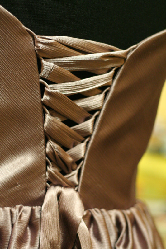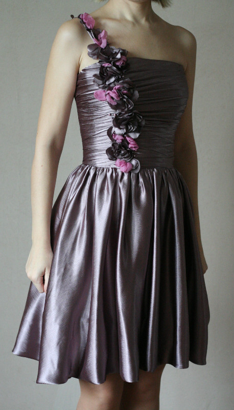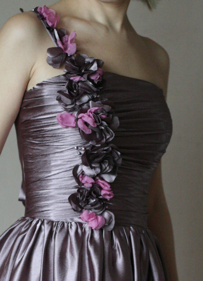 Легкое, нежное, летящее платье просто создано для девушки романтической. Украшают платье асимметричная драпировка, цветы из ткани и декоративная шнуровка на спинке.