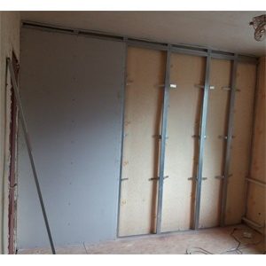 Обшивка стен гипсокартоном. Быстро и экономно можно выровнять внутренние стены помещения путем обшития их листами гипсокартона. Это очень удобно, например, в комнатах с неровными или заваленными стенами, выравнивание которых сопряжено со значительным расходом штукатурных материалов. Впоследствии на гипсокартон можно наносить шпаклевки, размещать различные декорирующие материалы: плитку, обои и др.