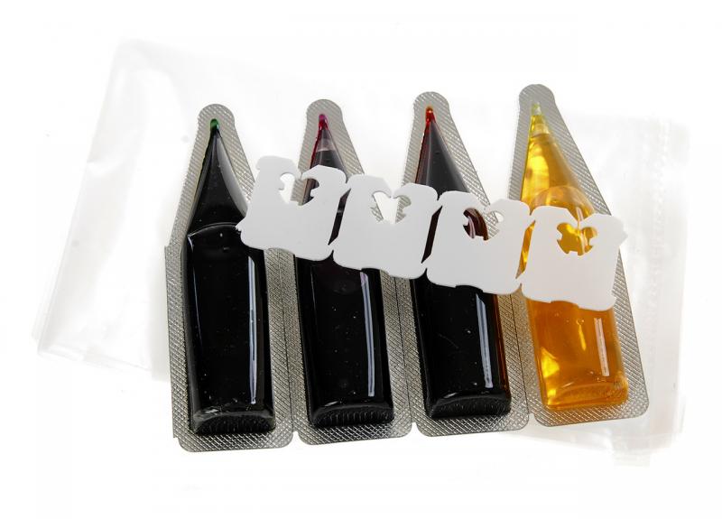 В комплект входит 4 капсулы с краской (малиновый, зеленый, желтый, оранжевый) по 5 мл, хватает для покраски 12-ти яиц.