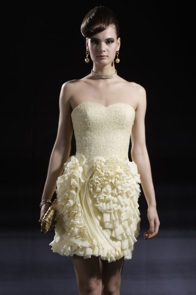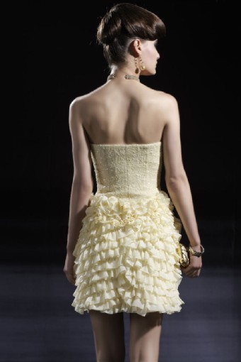 Короткое вечернее платье оригинального дизайна без бретелей.