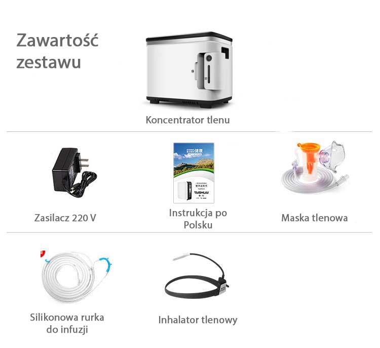 Комплектация: концентратор, фильтр, силиконовая трубка, кислородная маска, питания 220 В, автомобильный адаптер, пульт ДУ, ингалятор для установки за ухом, руководство пользователя на украинском, русском, английском.