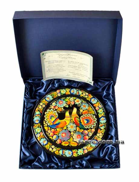 Подарочная тарелка с петриковской росписью в элитной упаковке с сертификатом. Тарелка расписана в ручную, d - 30 см. Продается в подарочной упаковке и сертификатом соответствия на двух языках: украинском и английском. Изготовлена из натурального дерева.