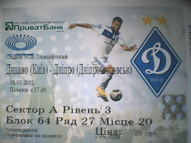 Продам билеты на футбол Динамо Киев-Днепр Днепропетровск 18марта сектор 64. тел.097-247 66 90