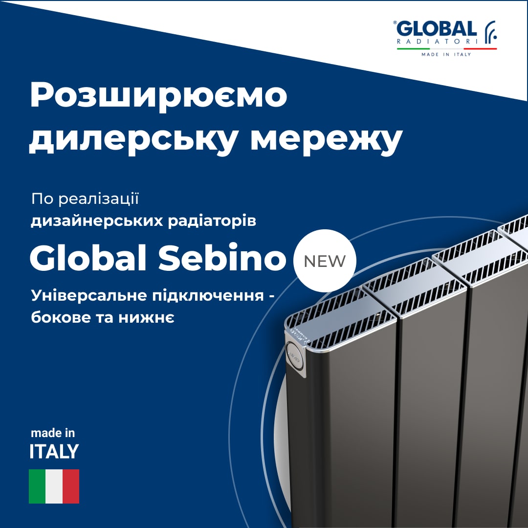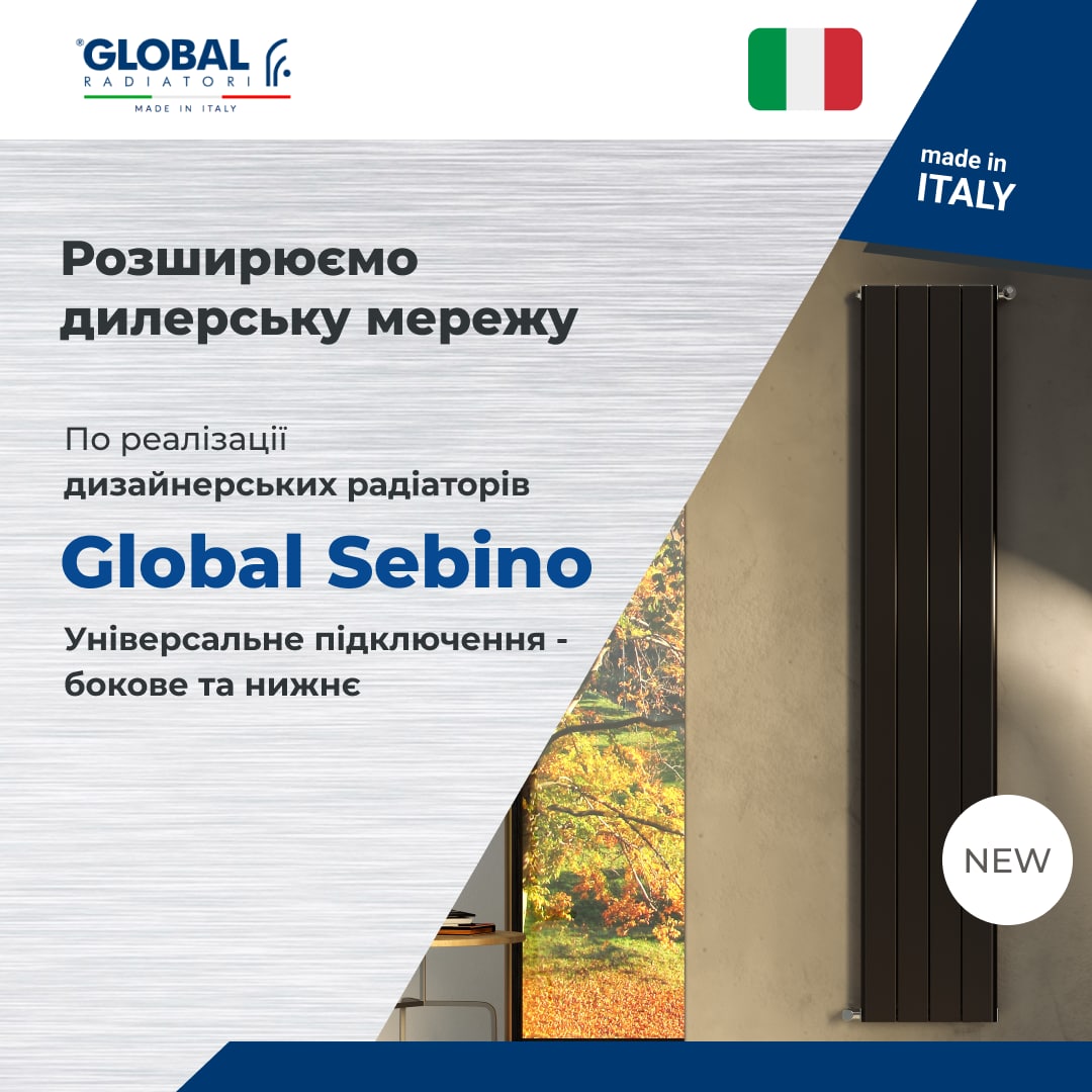 Новинки 2022: алюмінієві секційні радіатори Global Vox із нижнім підключенням, високі дизайн радіатори із нижнім підключенням Sebino заввишки 1600 від Global, радіатори VIP500 чорного кольору.