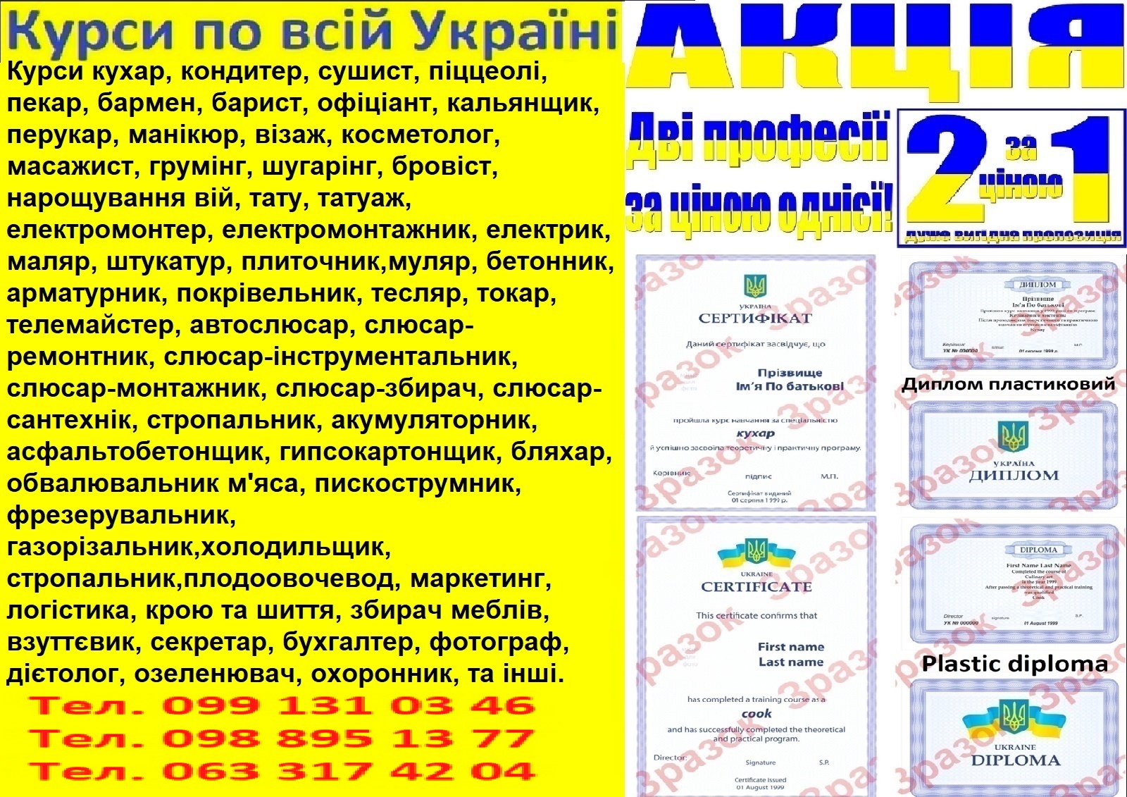 Курси перукар, манікюр, кухар, зварник, електрик, слюсар, токар, тесляр, візажіст, нарощування вій, тату, маркетинг, логістика, корекція брів вій, піццеола, крою та шиття, телемайстер, автослюсар, слюсар ремонтник, слюсар інструментальник, слюсар монтажник, слюсар збирач , автоколоріст, муляр, аніматор, грумінг, шугарінг, татуаж, зборщик меблів, плиточник, бухгалтер, секретар, слюсар сантехнік, акумуляторникк, асфальтобетонщик, холодильщик, гипсокортонщик, стропальник, фотограф, діетолог, пилорамник, прогаміст, бармен, озеленювач, бляхар, шліфувальщік, плодоовочевод, офіціант, мерчендайзер, охоронець, пекар, барист, продавець, флористика, сушіст, взуттєвик, обвальщик м'яса, декоратор, кінолог, пескострумнник, фрезерувальник, газорізальник, зуборізальник, психолгія, кондитер, масажист, ювелір, косметол, арматурник, маляр, штукатур, електромонтажник, покрівельник, та інщі.