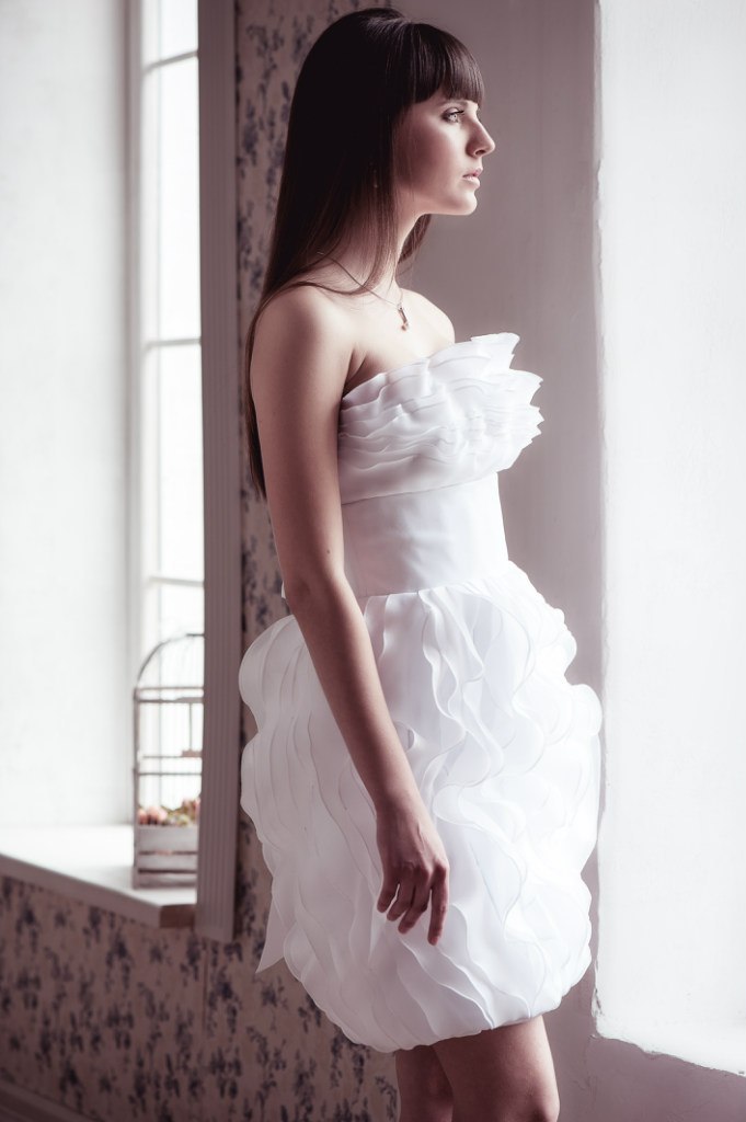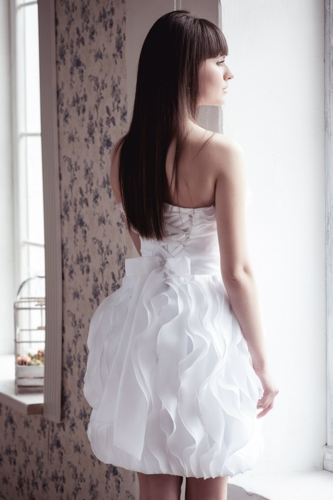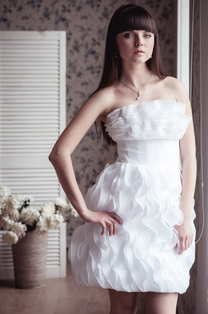 Короткое свадебное платье из органзы. По спинке изделия шнуровка, что обеспечит идеальную посадку платья по фигуре. Все рюши обработаны московским швом.
