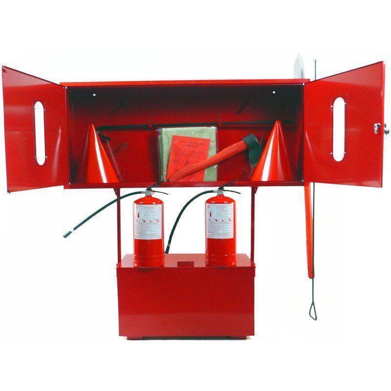 - Пожежні стенди з відкритим щитом. Ідеальне рішення для підприємств, яким важливо тримати інвентар під рукою та мати окремий ящик для піску. Завдяки продуманій конструкції стенд займає мінімум місця, зберігаючи при цьому всю необхідну комплектацію. Ціна — 5286 грн з ПДВ.