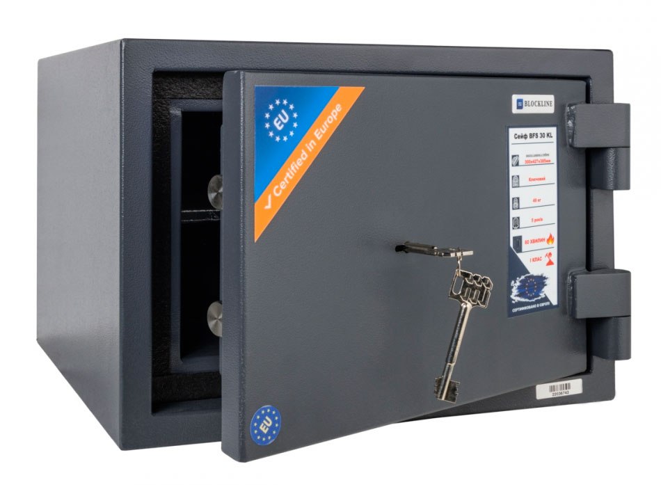 Інтернет-магазин VinCom являється офіційним дилером Blockline в Україні та пропонує купити міцний надміцний сейф Blockline BFS 30 KL. Основні технічні характеристики вогнезламостійкого сейфу Blockline BFS 30 KL: зломостійкість по EN 1143-1 I клас, вогнестійкість по EN 15659 LFS 30P клас, ключовий замок, зовнішні розміри (ВхШхГл) 300x427x410 мм, внутрішні розміри (ВхШхГл) 170x316x235 мм, внутрішній об'єм 13 л, колір RAL 7024 (Сірий графіт), вага 49 кг, 1 полиця, тристороння система замикання.