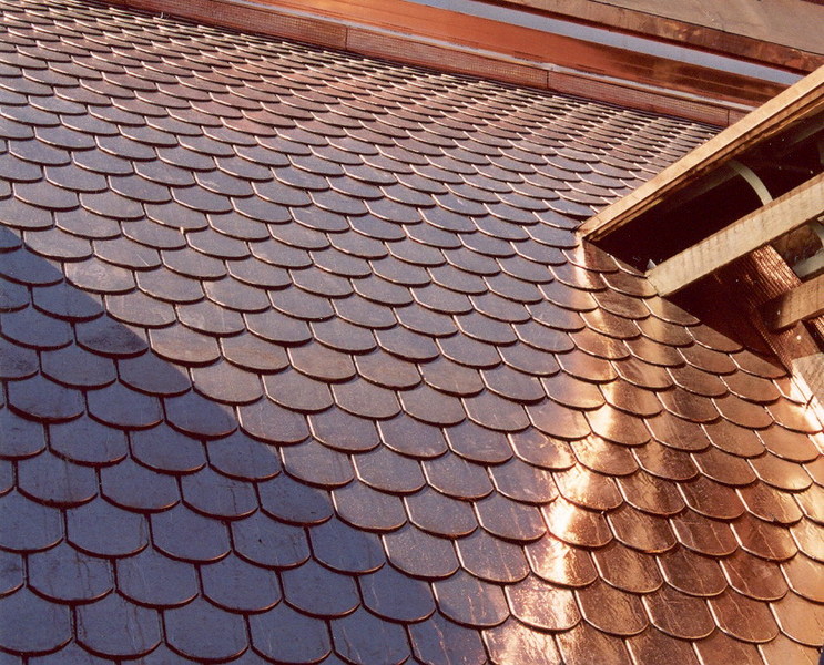 Медная черепица BRAI . Коллекция Giotto выпускается в форме хвоста бобра (полукруг). Форма оптимально подходит для закругленных или кровель с радиальными переходами. АПП модифицированный состав битума усиленный армирующим слоем из плотного стеклохолста сочетают одновременно прочность материала с эластичностью. Верхнее покрытие из медной фольги со специальными прожилками, придает покрытию респектабельный состаренный вид и одновременно служит для снятия внутренних напряжений между медью и битумной смесью. Коллекция имеет полный комплект доборных элементов: ендовые ковры, коньковые элементы, стартовые полосы, аэраторы, снегоразрезатели, гвозди и пр.
