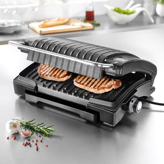 Поверхность нагреваемых пластин с глубокими канавками придаёт блюдам типичный гриль-рисунок и позволяет жиру при готовке стекать в специальный поддон.