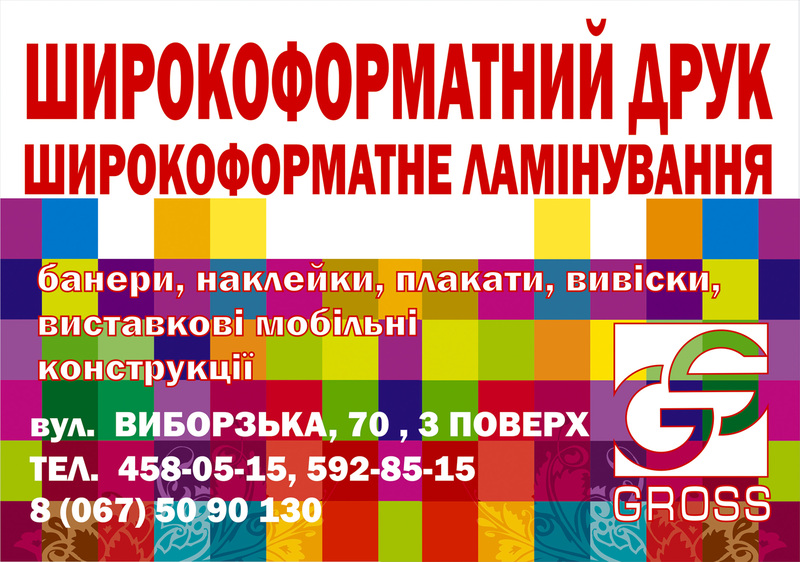 ПП «Гросс» - це компанія, що динамічно розвивається. Основний напрямок діяльності - надання друкованих послуг великого формату, як зі звичайним, так і з фотографічною якістю.