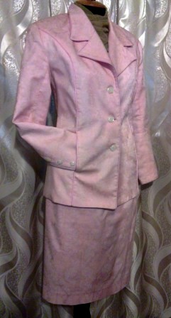 Продам костюм. Очень красивый. Из бледно-розового хлопкового жакарда с эластаном. Костюм на 100% натуральной шелковой подкладке. Размер 46, рост 150-158. Мерки: длинна жакета 60, 5см, длинна юбки 57см, ширина по плечам 41см, рукав 55, 5см, талия юбки до 77см, бедра юбки до 95см, обхват груди до 95см. Одет 1 раз. Цена 300грн. Возможна пересылка