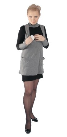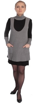 Длинные манжеты на рукавах и высокая горловина из серой ткани платья визуально «вытягивают» фигуру, верхняя серая туника красиво драпирует любые несовершенства фигуры после родов. Крой и тянущаяся ткань платья позволяют его носить также и во время беременности.
