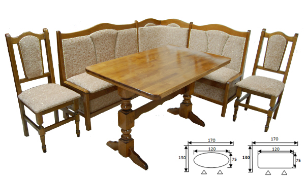 Надежный, красивый и изысканный гарнитур гармонично сочетает темный цвет натурального дерева и светлую с блеском обивку. Высокий обеденный стол на двух ножках подойдет не только для кухни в частном доме, но и для ресторана или кафе. Классический дизайн мебели позволит аккуратно вписать этот гарнитур в любой интерьер. Даже современные отделки стен, пола и потолка при умелом подходе будет выигрышно смотреться рядом с элегантной роскошью натурального дерева и качественной изысканной ткани.