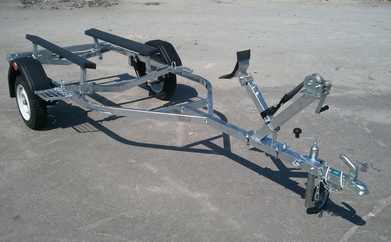 Прицеп для перевозки надувной лодки (ПВХ, резиновой лодки) длиной до 3.6м грузоподъемностью 400кг, рессора АЛКО (Германия), полностью регулируемая система опор и направляющих, съемный бампер, опорное колесо, лебёдка. Цена 5700грн. Эта модель в оцинковке 6400грн.