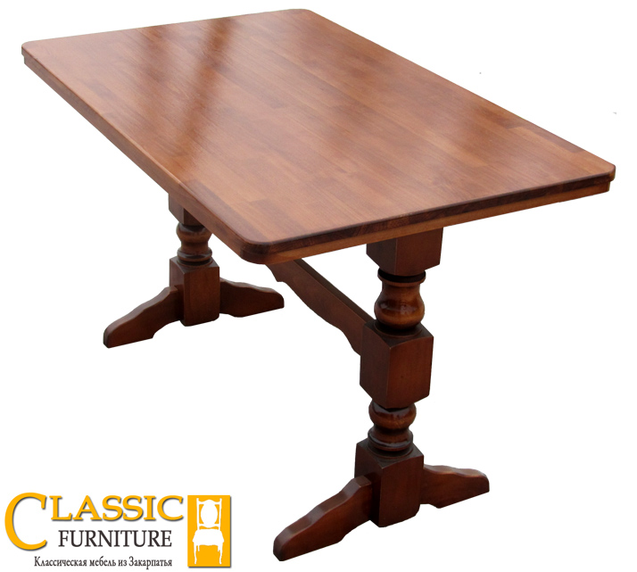 Золотисто-коричневий колір лаку, яким покрито цей стіл, робить його надзвичайно практичним і елегантним. Він впишеться в будь-який інтер'єр, гармонійно доповнить його і стане прикрасою вашого будинку або кафе. Великий розмір стільниці, виготовленої за матеріалом «єврощит» (кілька рейок з натурального бука, склеєних за спеціальною технологією), задовольнить потреби навіть великої родини.
