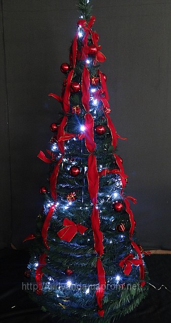 "Зеленая ель 1, 8 м": высота - 1, 8м, провод - прозрачный ПВХ, кол-во светодиодов - 120 LED, напряжение - 24В, цвет - зеленый, украшена игрушками. Цена - 1428 грн.