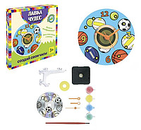 Набор для изготовления часов ручной работы. В наборе есть все необходимое для изготовления часов - основа, механизм, подставка, краски, кисточка.