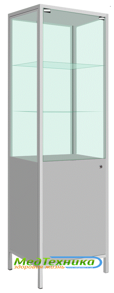 Размеры шкафа: 400х500х1600. Каркас изготовлен из алюминиевого профиля, стенки и двери нижней части — из ламинированного ДСП с пластиковой кромкой 2мм. Полочки верхней части стеклянные. Нижнее отделение имеет полочку из ДСП и закрывается на ключ, что позволяет безопасно хранить медикаменты, не предназначеные для широкого доступа.